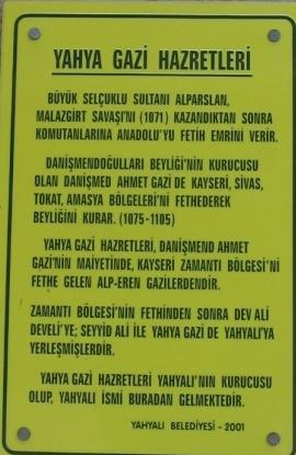 Yahyalı Ulu Cami bahçesinde türbesi bulunan Yahya Gazi, günümüze kadar gelen kitabesinden de anlaşıldığına göre Yahyalının kurucusu ve ilçeye adını veren kişidir. 1075 yılında kurulan Danışmendoğulları beyliği Sivas, Tokat, Niksar, Zamantı, Develi ve çevresine hakimdir. Yine bazı Avrupalı tarihçilerle beraber Doğulu tarihçiler, Kayseri ile bütün o yörenin fethinin Danişmendliler'e nasip olduğunu bildirirler. Dev Ali (Devlibey) türbesinin kitabe tarihi 1094 olup Yahyalıoğullarıyla birlikte bölgeye gelen Develi oğullarının bu tarihten önce yerleştikleri kesindir. Yahya Gazi, Seyid Ali, Benli Gazi gibi alp-eren önderlerden sonra Abdal İlyas, Dede Sultan, Hoca Ahmet gibi din büyükleri Yahyalının temelinde harcı olan mübarek şahsiyetlerdendir.